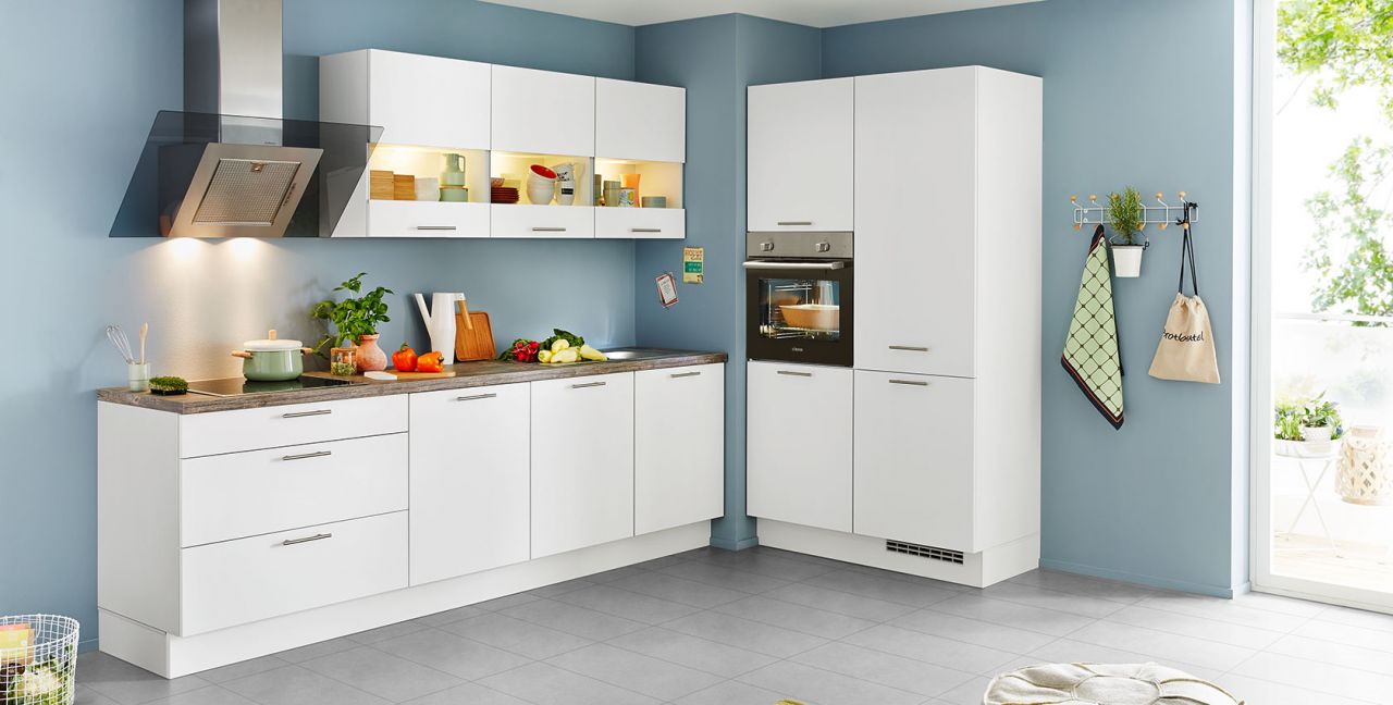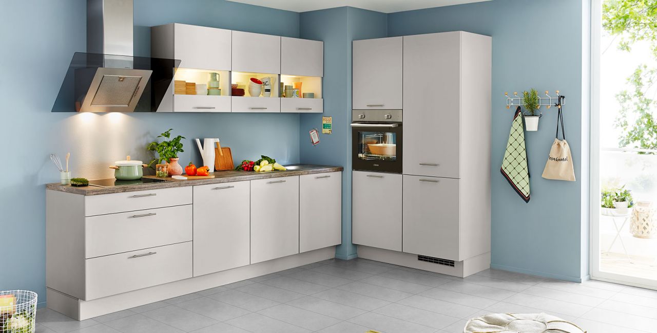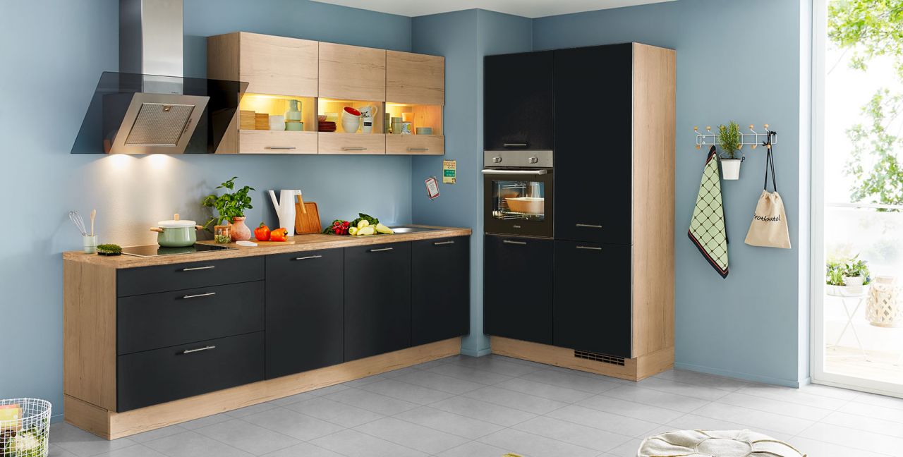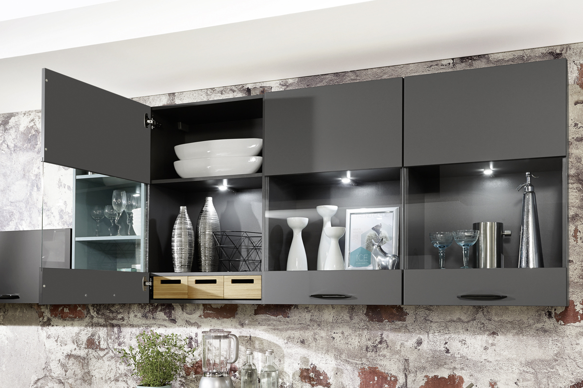 Inklusive Einbaubackofen Edelstahl Altus BSN1200RX Energieeffizienzklasse A, Glaskeramik Kochfeld Altus KAN1200EX, Designesse Edelstahl / Schwarzglas Airforce F134-90 S4 BK Energieeffizienzklasse C, Kühlschrank Altus KS910 Energieeffizienzklasse E, Einbauspüle Edelstahl Rodi Okio Line 85 Deep, Unterschrank mit Frontauszügen, Wandschränken mit Segmentglastür.